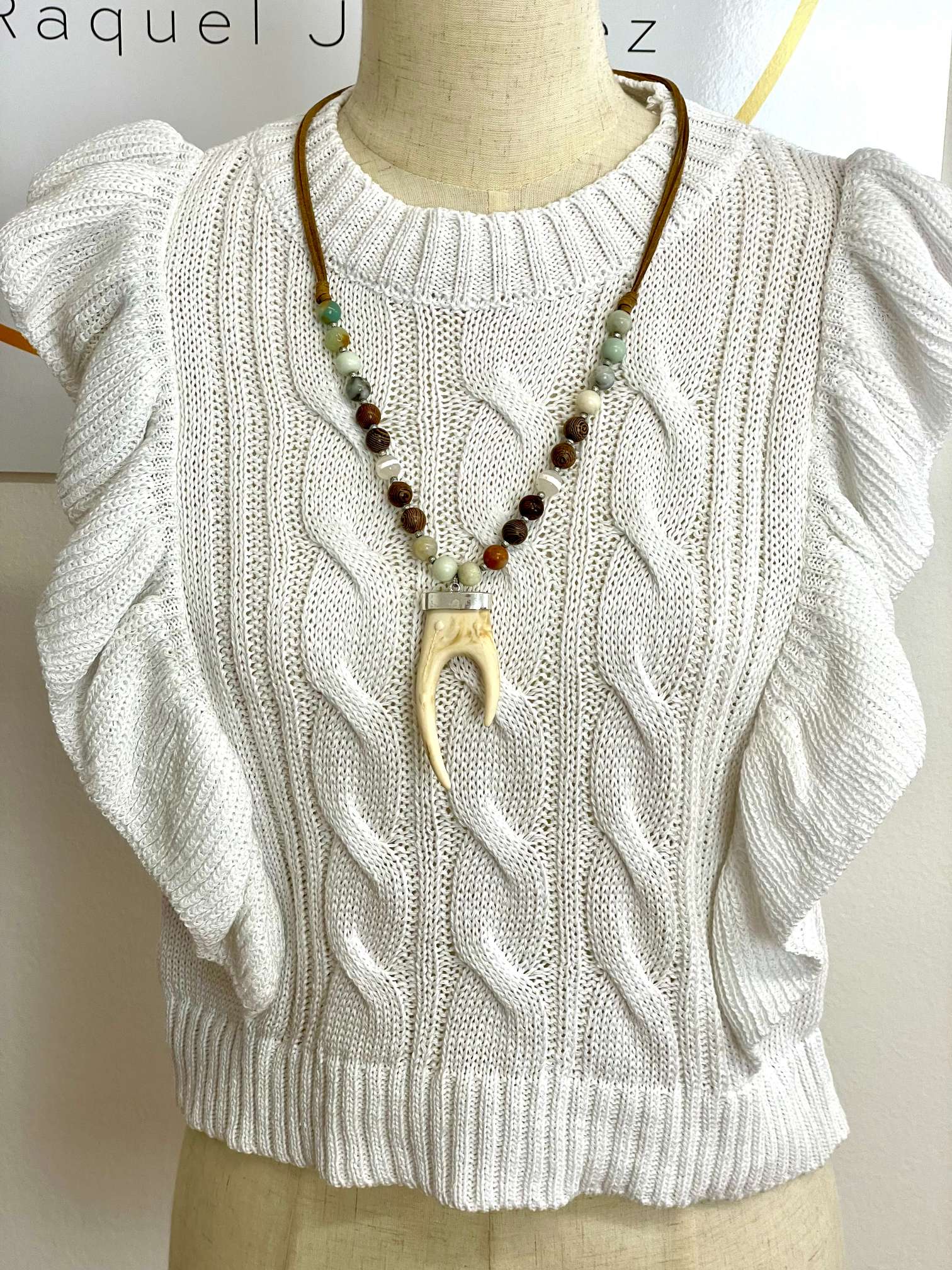 Este chaleco de punto blanco es una elección perfecta para añadir un toque de suavidad y feminidad a tu conjunto. Con su diseño elegante y detalle de volantes en las mangas, esta blusa es una opción versátil que puedes combinar fácilmente con diferentes prendas. Llévala con unos jeans para un look casual o combínala con una falda para una ocasión más especial.