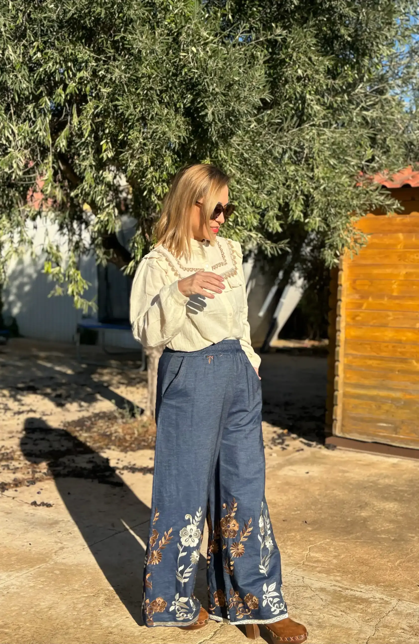 4. Outfit bohemio con pantalones anchos y blusa estampada: