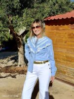 Camisa denim azul claro con puntilla blanca en pecho. Tiene un volante en parte delantera