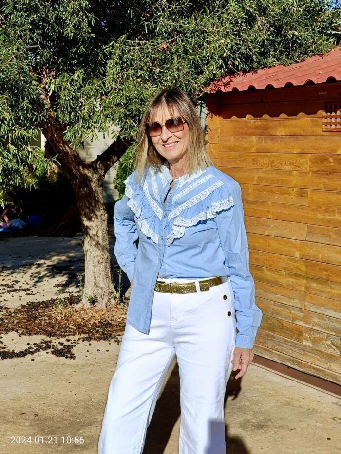 Camisa denim azul claro con puntilla blanca en pecho. Tiene un volante en parte delantera