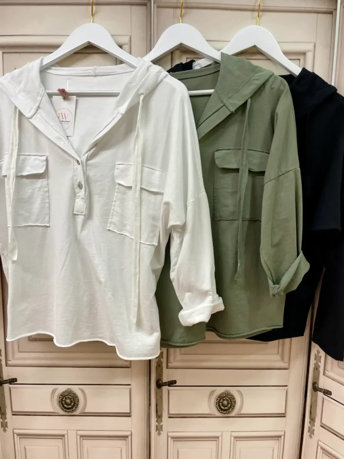 Camisa casual con capucha con cordón para ajustar. Lleva dos bolsillos en la parte delantera y abrocha con 3 botones.