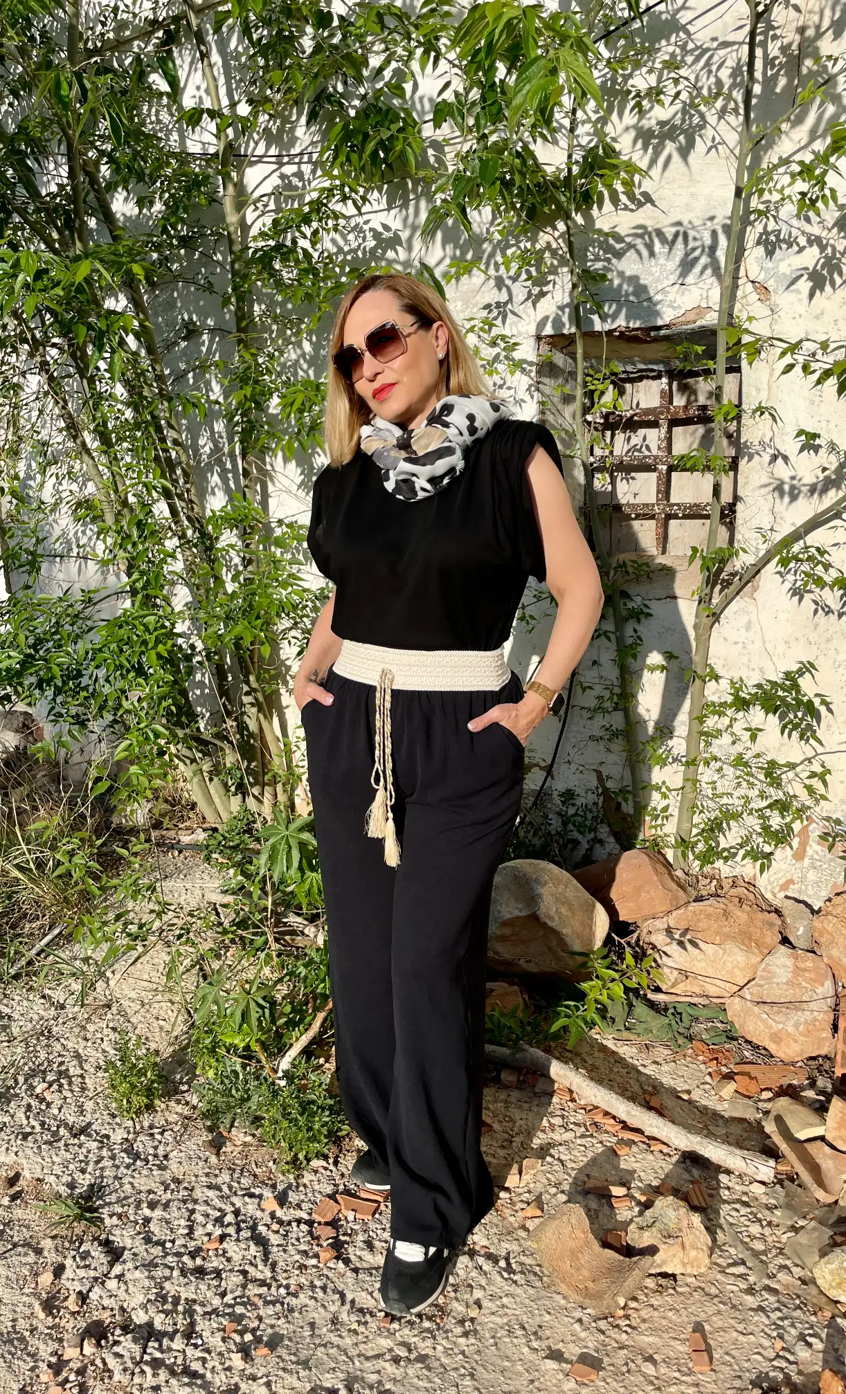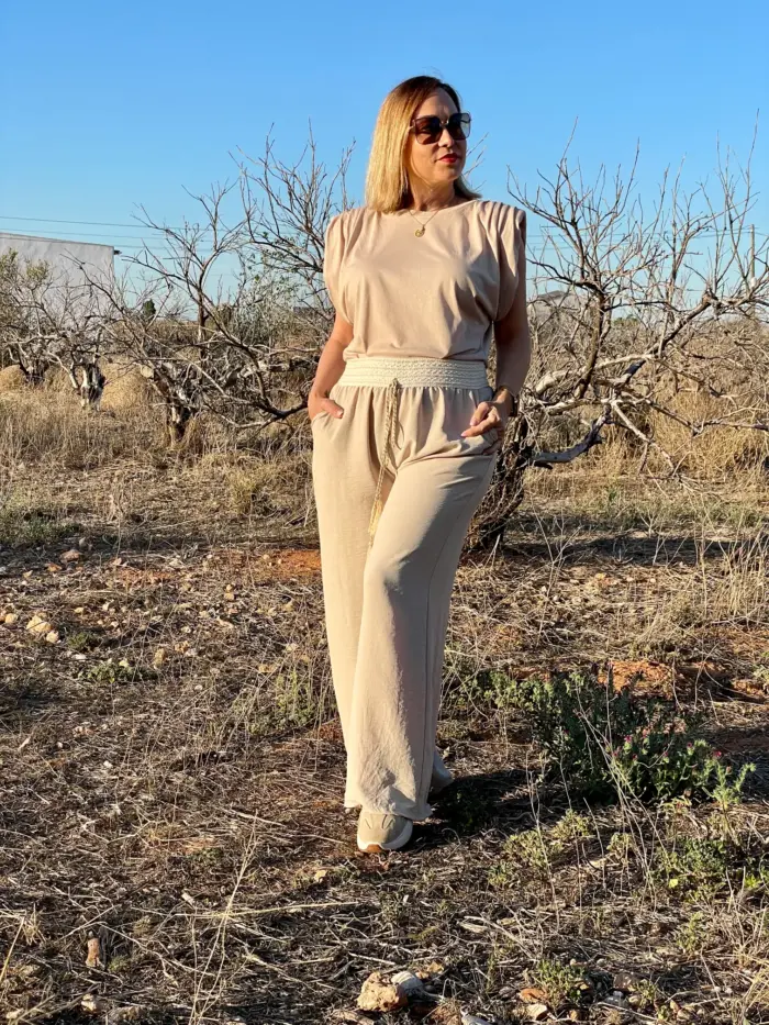 Camiseta básica con grandes hombreras fruncidas. Disponible en blanca, beige y negra