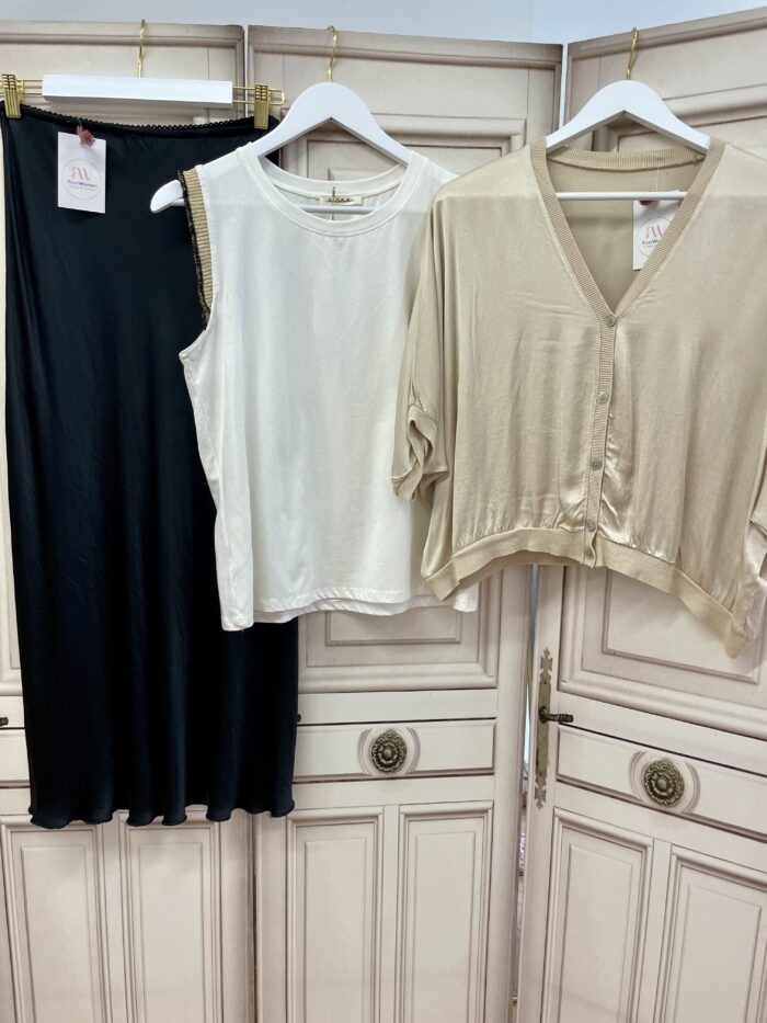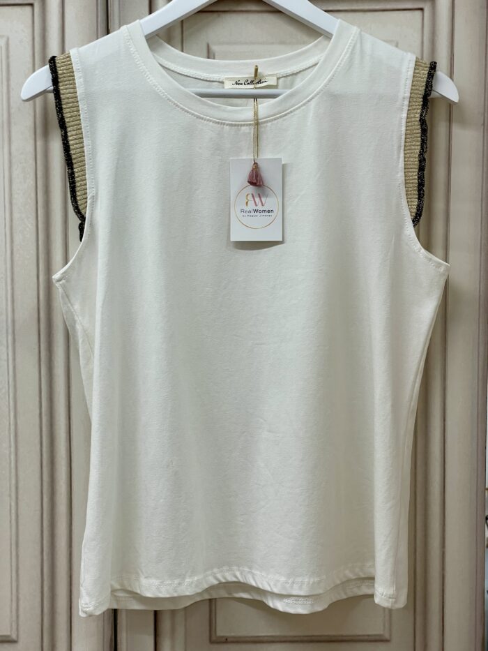 Camiseta básica con detalles en las mangas con brillo en tonos beige y negro.