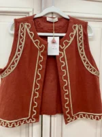 Bonito chaleco que te ayudará a realzar cualquier look. Es abierto y lleva un bordado alrededor de toda la prenda en dorado