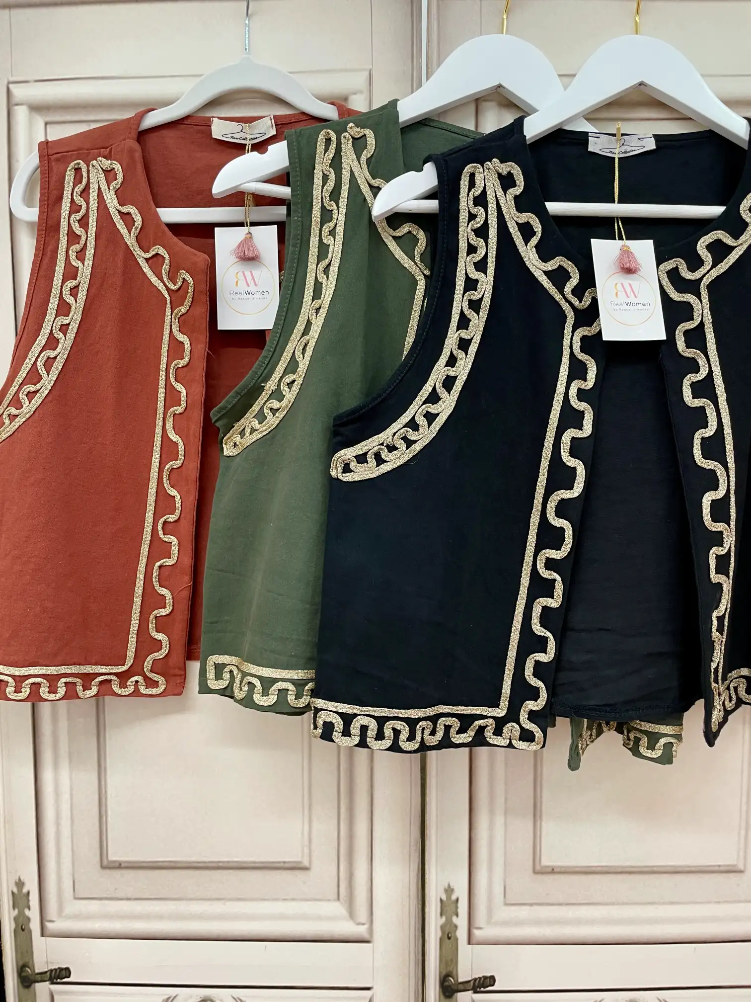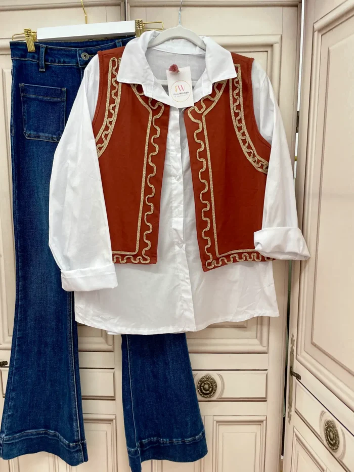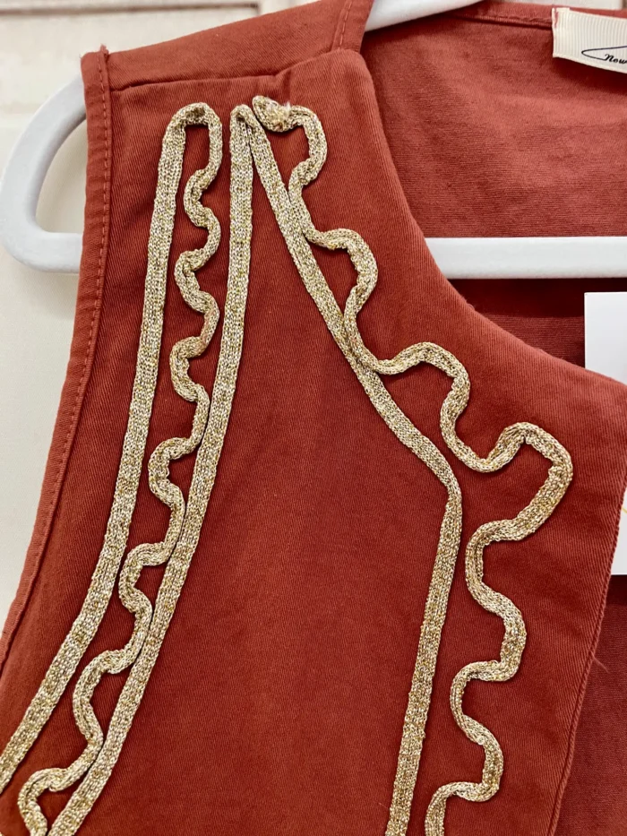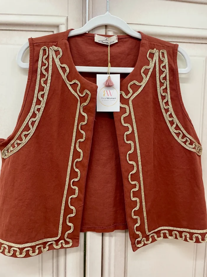 Bonito chaleco que te ayudará a realzar cualquier look. Es abierto y lleva un bordado alrededor de toda la prenda en dorado