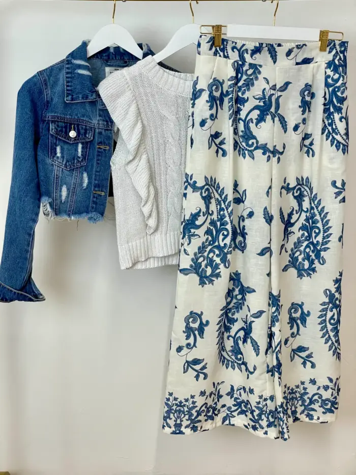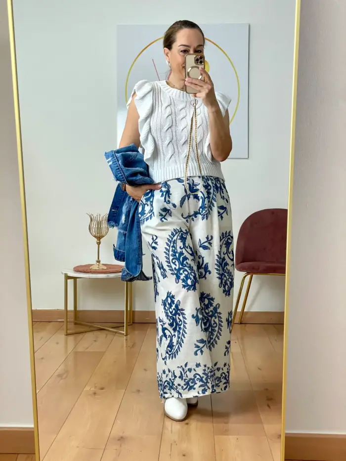 Chaleco punto blanco con volante en los hombros. Tiene trenzas en la parte delantera