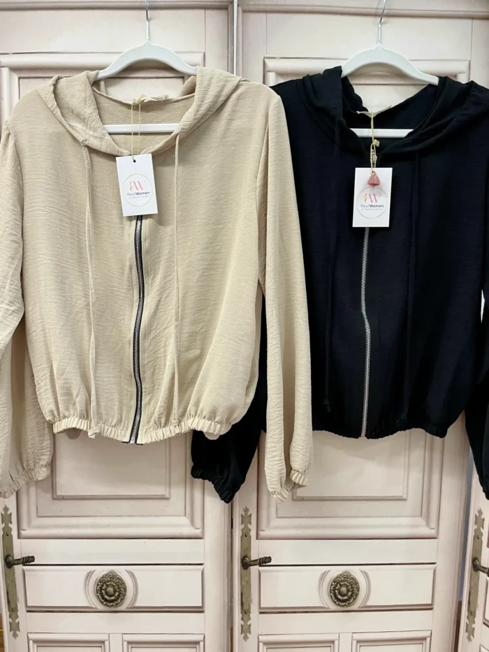 Chaqueta con capucha, perfecta para entretiempo porque es de tejido fino. Lleva cremallera en plateado. Lleva goma tanto en la cintura como en los puños y es cortita. Tiene bolsillos a los lados