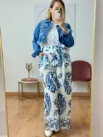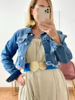 Chaqueta vaquera cortita. Tiene fotos por varios sitios y está desflecada en el bajo. Tiene dos bolsillos y los botones son plateados