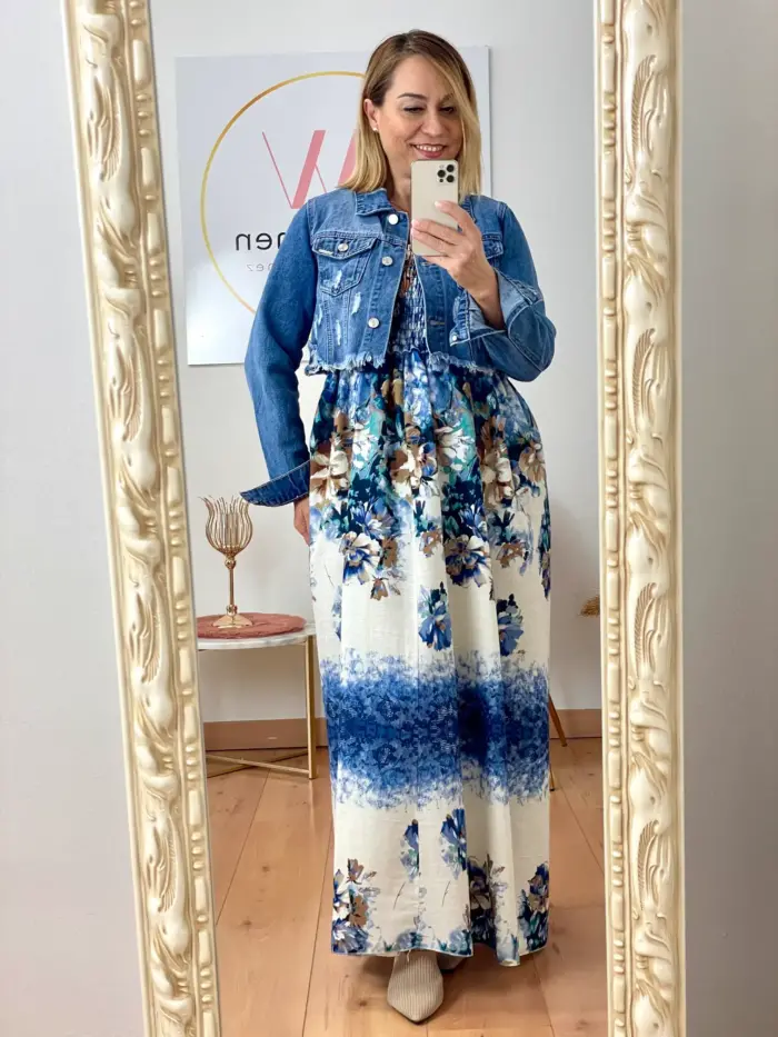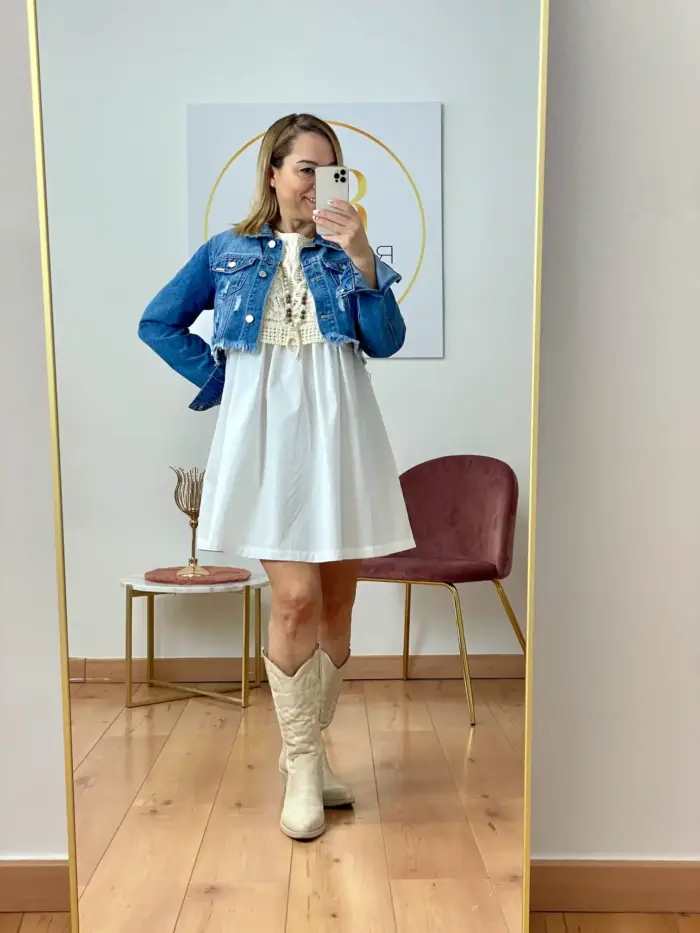 Chaqueta vaquera cortita. Tiene fotos por varios sitios y está desflecada en el bajo. Tiene dos bolsillos y los botones son plateados