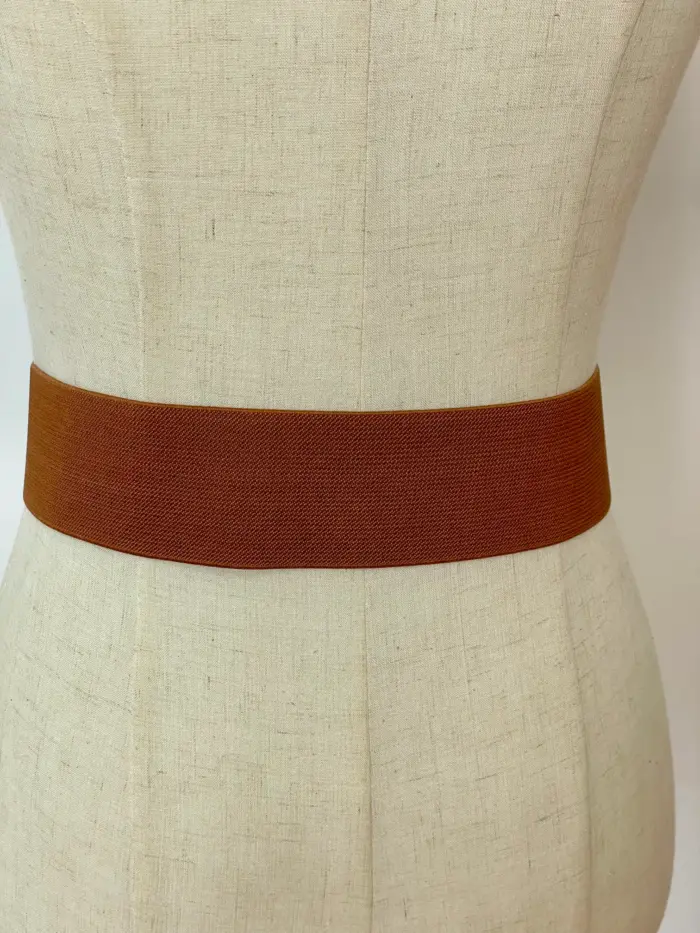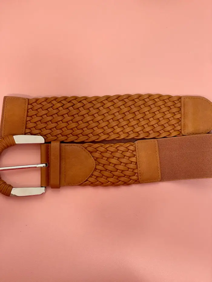Cinturón con goma y con toda la parte delantera y la hebilla trenzadas. Es auto regulable y el ancho mide 6 cm