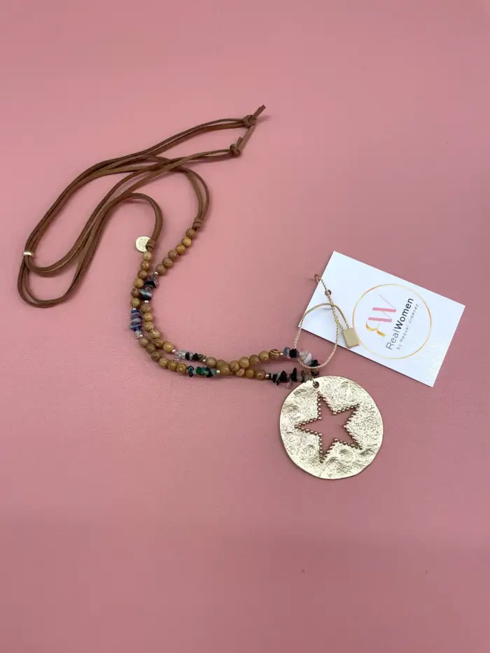 Collar de cuentas en tonos marrones con un medallón dorado circular y una estrella en el interior
