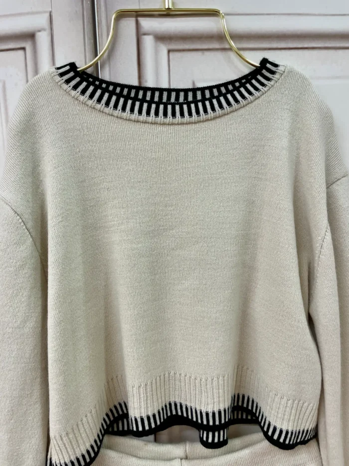 El jersey mide de largo 42 cm y puedes llevarlo solo o con una camisa bajo. Tiene las mangas ligeramente acampanadas y tiene un pespunte de contraste de color tanto en el cuello como en los puños.
