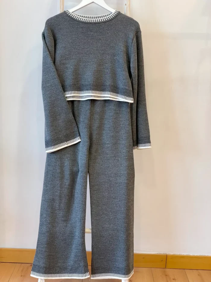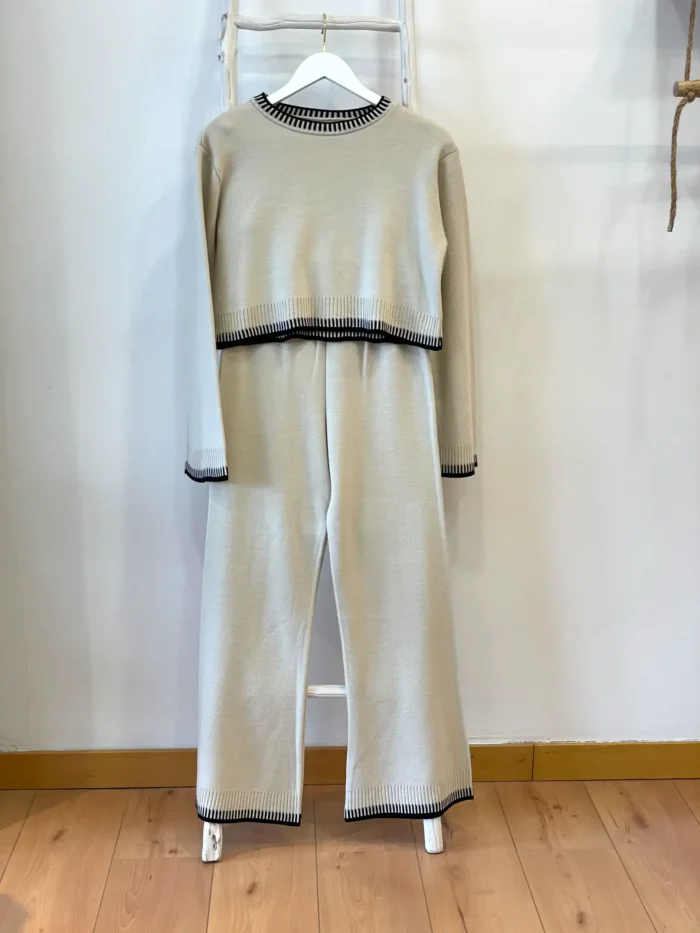 El pantalón tiene goma ancha en la cintura y es ligeramente acampanado. Tiene pespuntes de contraste de color en los bajos. Largo aproximado de 104 cm