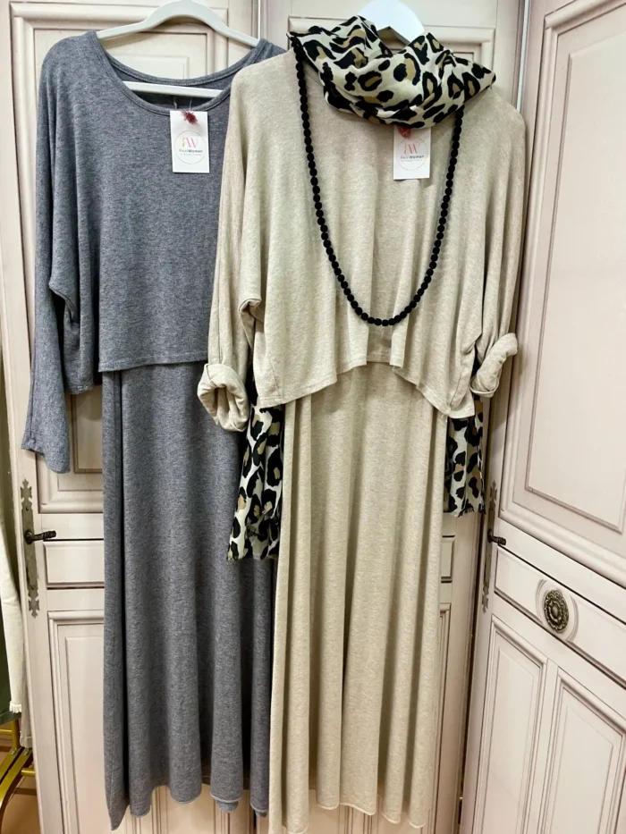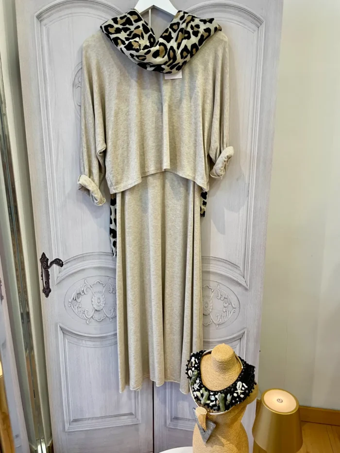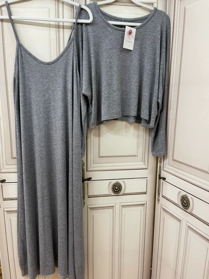 Conjunto compuesto de vestido de tirantes de punto con jersey muy ancho por encima. Se convertirá en uno de tus looks favoritos.
