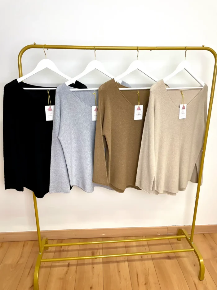 Jersey punto de tejido muy suave. Tiene el cuello de pico y es amplio.