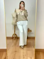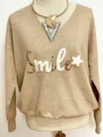 Jersey en punto fino muy suave. Es beige y tiene unas letras en tono marfil y en relieve y unas lentejuelas doradas. Cuello de pico
