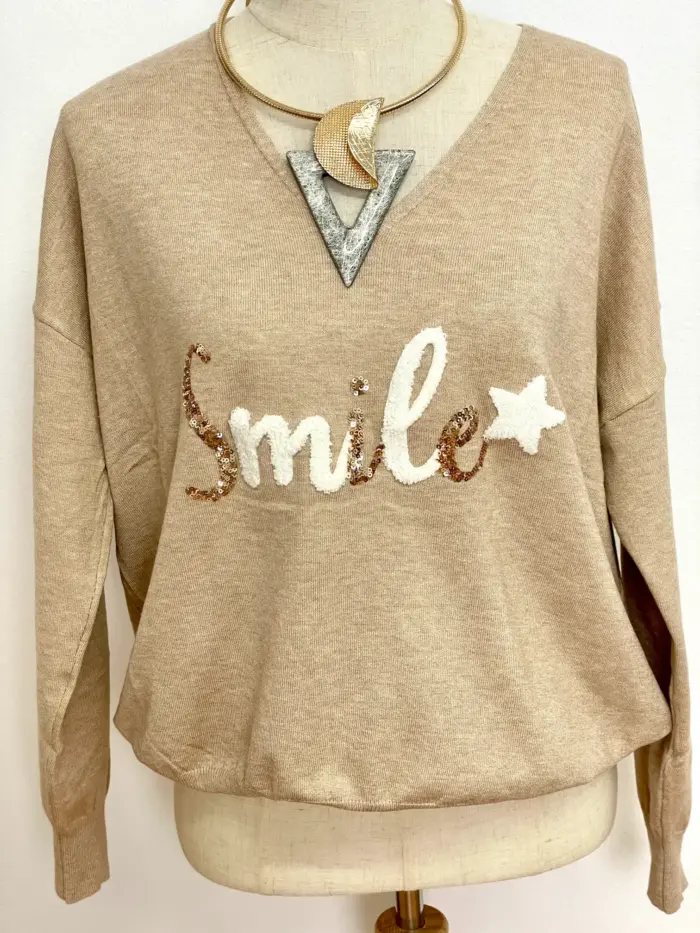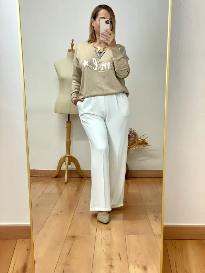 Jersey en punto fino muy suave. Es beige y tiene unas letras en tono marfil y en relieve y unas lentejuelas doradas. Cuello de pico