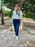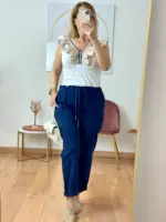 Pantalón estilo jogger con bajo con dobladillo. La cintura está engomada y fruncida y tiene cordón para ajustar. Llevan elástico. Dos bolsillos laterales. Largo aproximado sin doblar 93cm