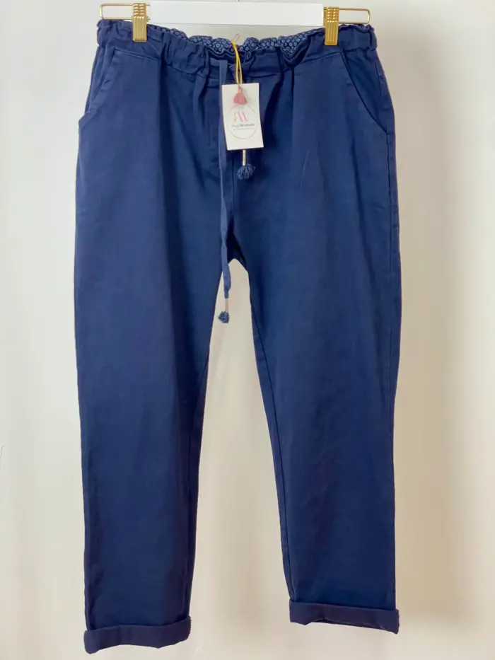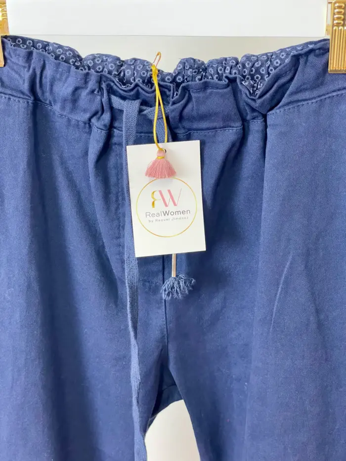 Pantalón estilo jogger con bajo con dobladillo. La cintura está engomada y fruncida y tiene cordón para ajustar. Llevan elástico. Dos bolsillos laterales. Largo aproximado sin doblar 93cm