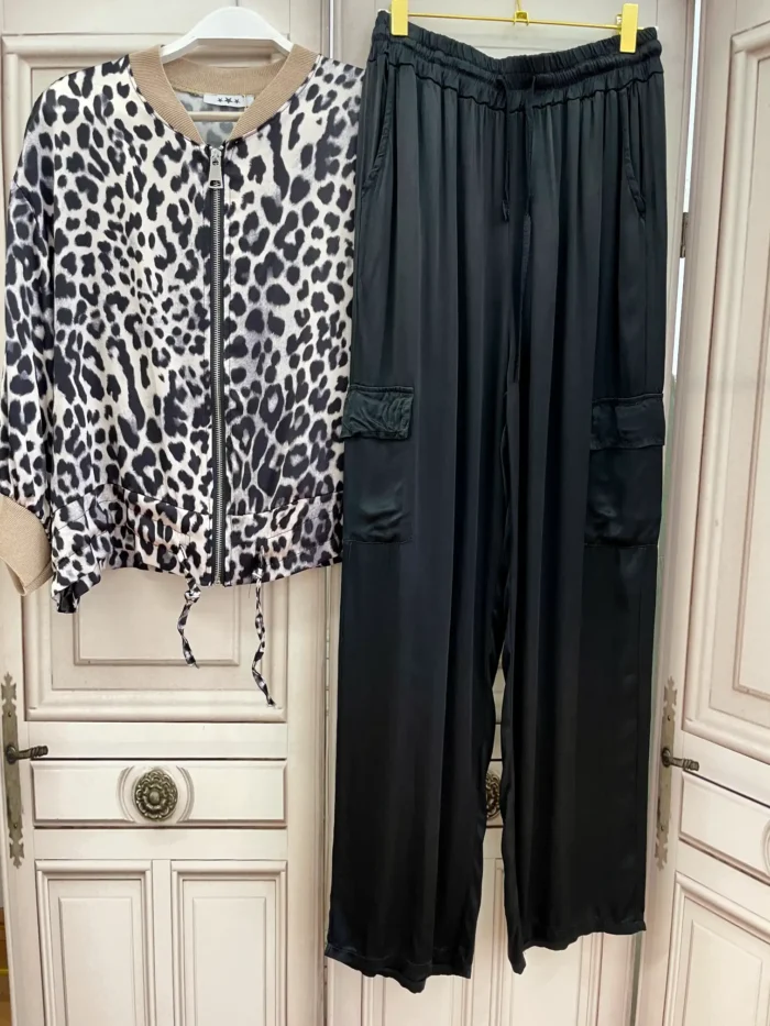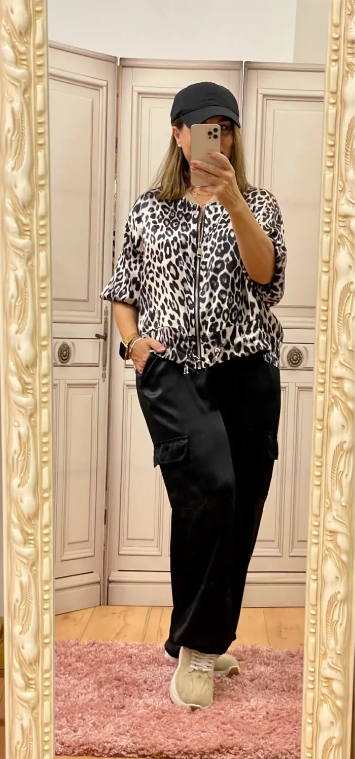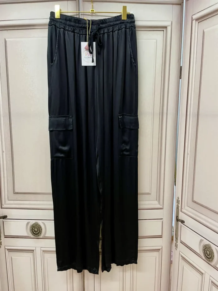 Pantalón satinado estilo cargo. Lleva la cintura engomada y un cordón para ajustar. Tiene bolsillos a los lados.