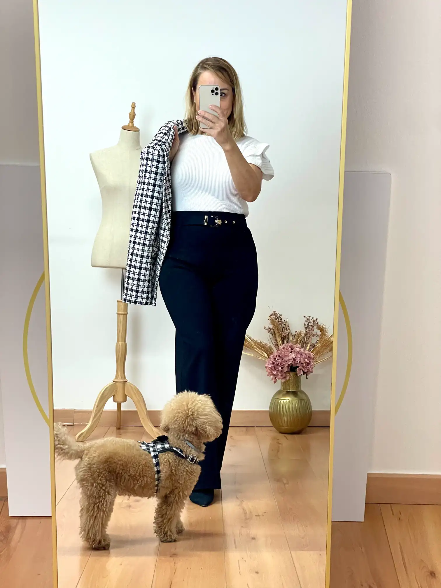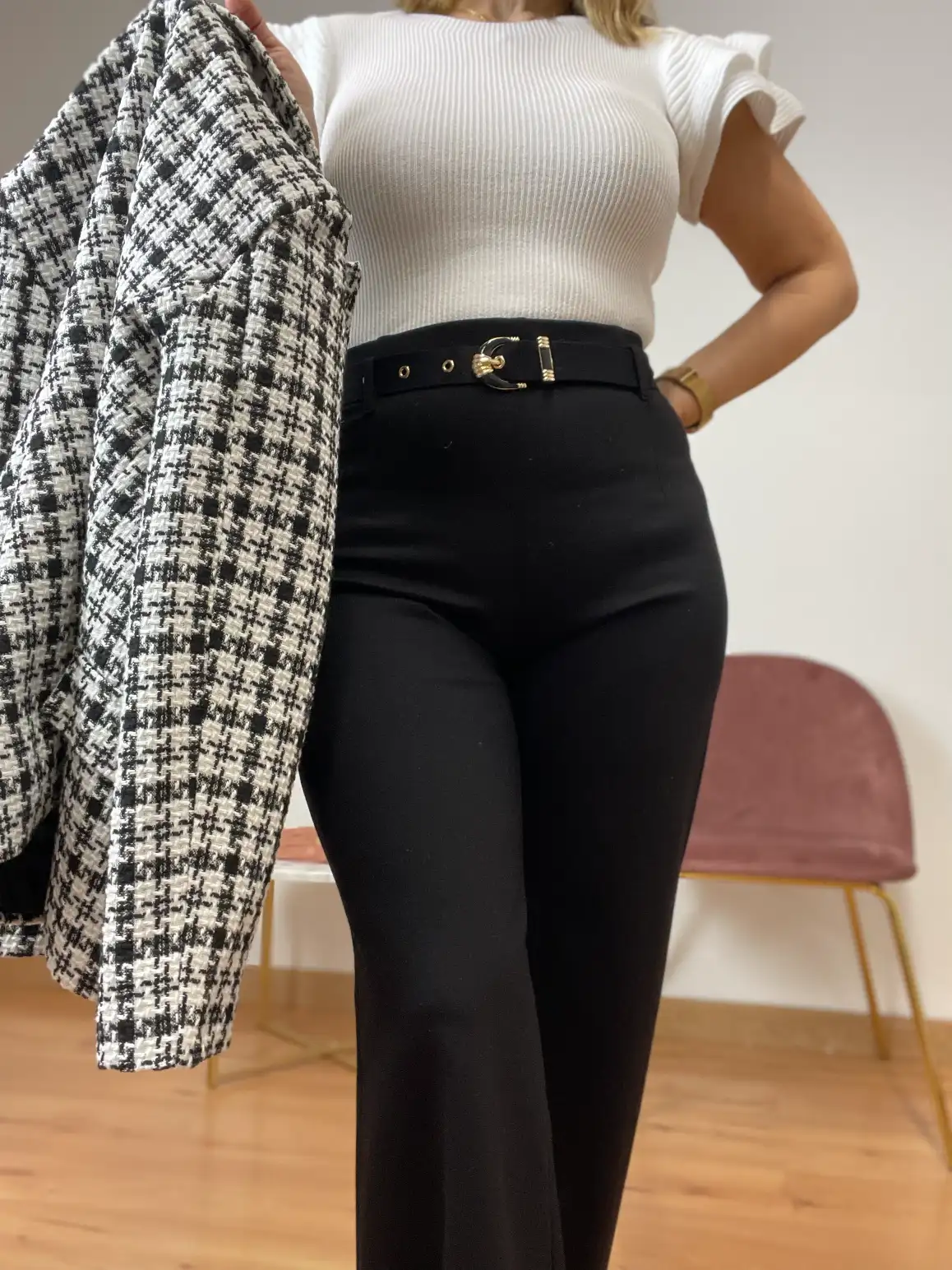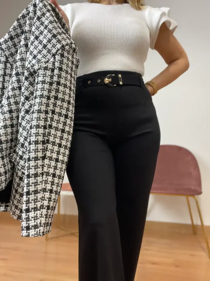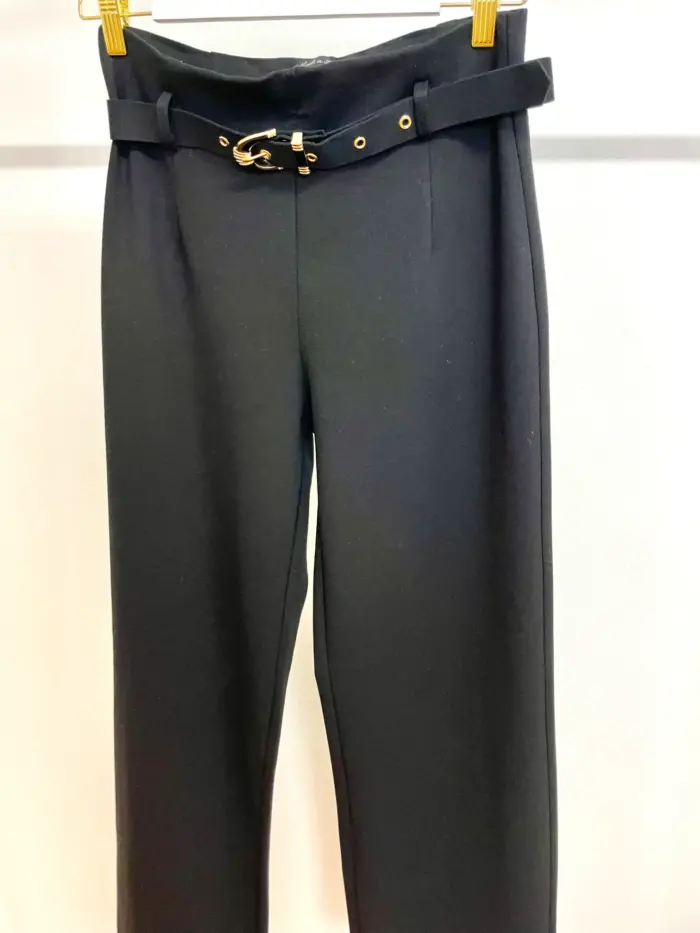 pantalón de vestir muy cómodo. Es elástico y lleva goma en la cintura. Camal recto. Talla alto. Tiene un cinturón con detalles en dorado. Largo aproximado desde cintura 103cm