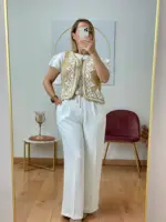 Pantalón de pinzas muy fluido y con mucha caída. Es recto. Lleva trabillas en la cintura para cinturón, bolsillos a ambos lados y falsos bolsillos en la parte trasera. Largo aproximado desde la cintura 108cm