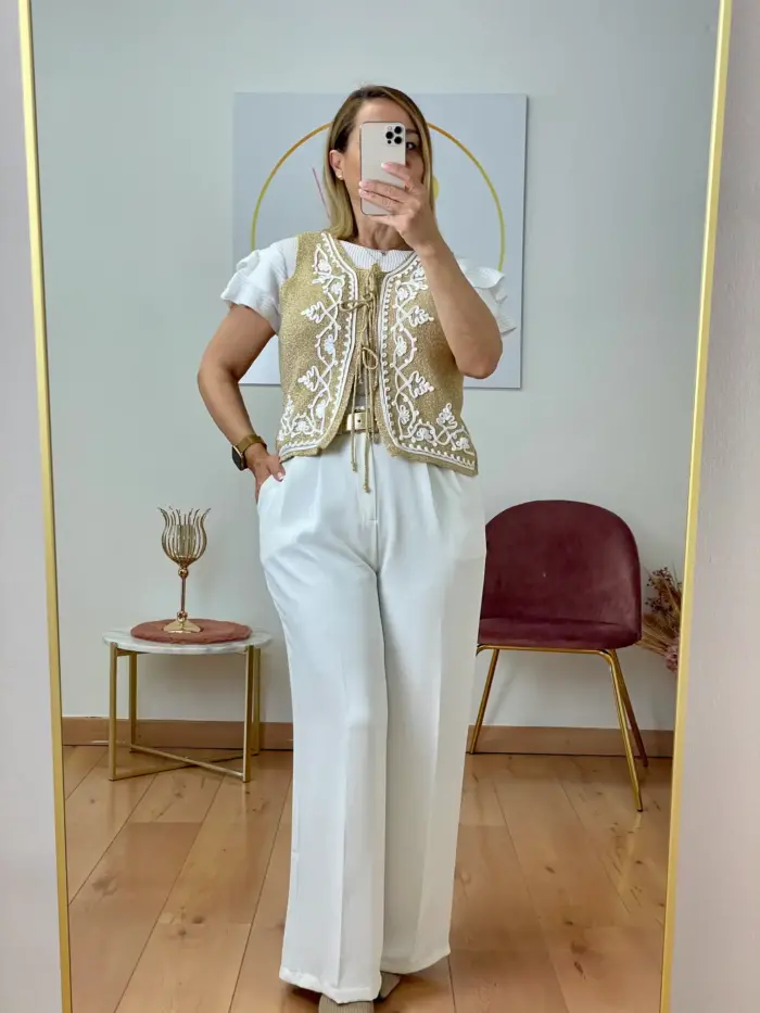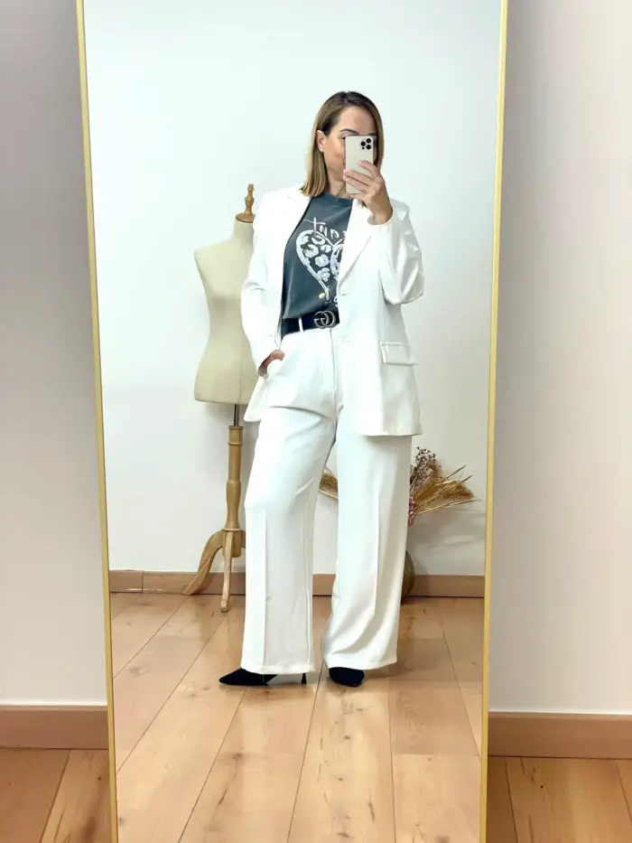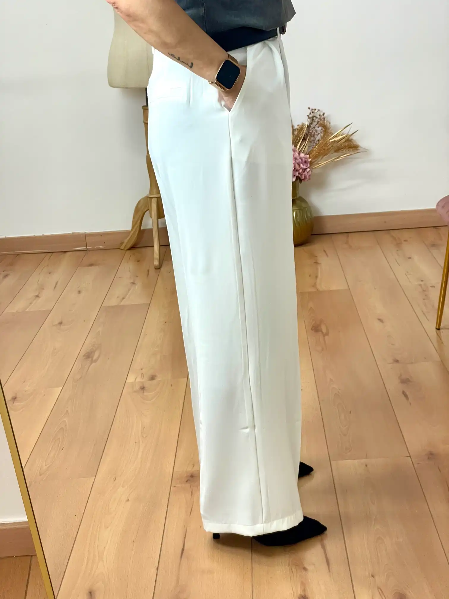 Pantalón de pinzas muy fluido y con mucha caída. Es recto. Lleva trabillas en la cintura para cinturón, bolsillos a ambos lados y falsos bolsillos en la parte trasera. Largo aproximado desde la cintura 108cm