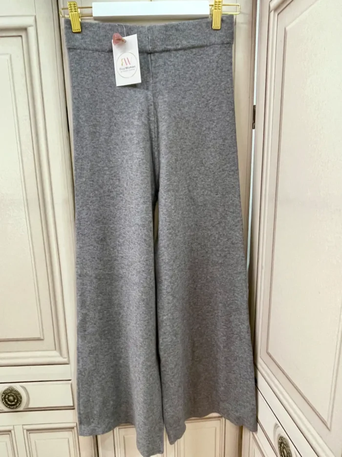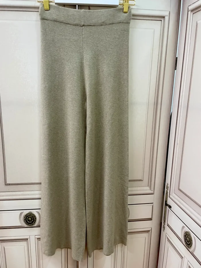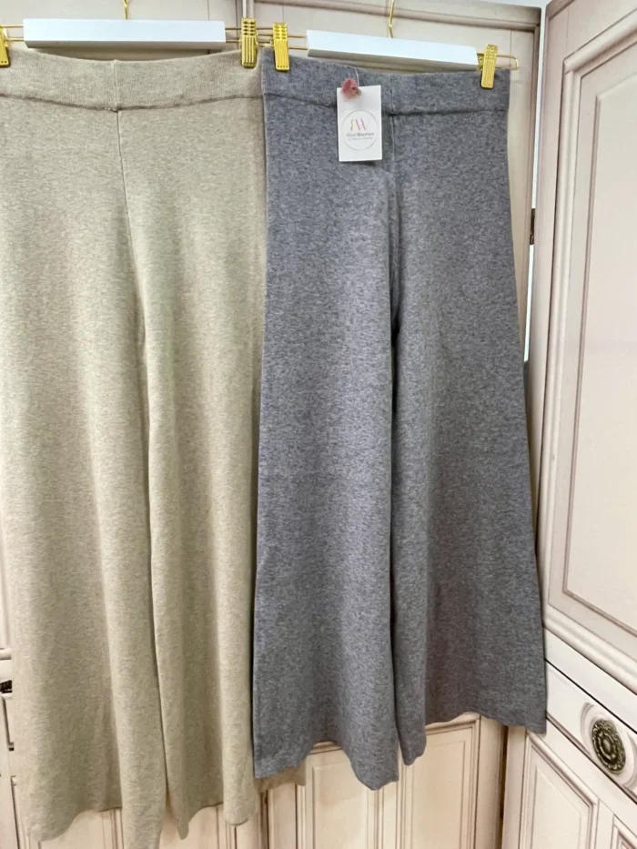 Pantalón de punto. Camal recto y ancho. Goma invisible y ancha en la cintura. Largo aproximado 99 cm