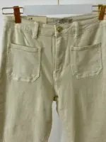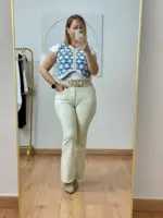 Estos vaqueros elásticos te van a encantar. Llevan dos bolsillos cuadrados en la parte delantera y trabillas en la cintura. En la parte trasera también llevan dos bolsillos. El bajo es acampanado y va desflecado