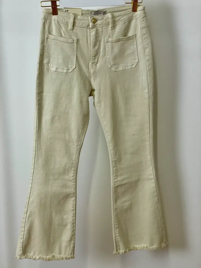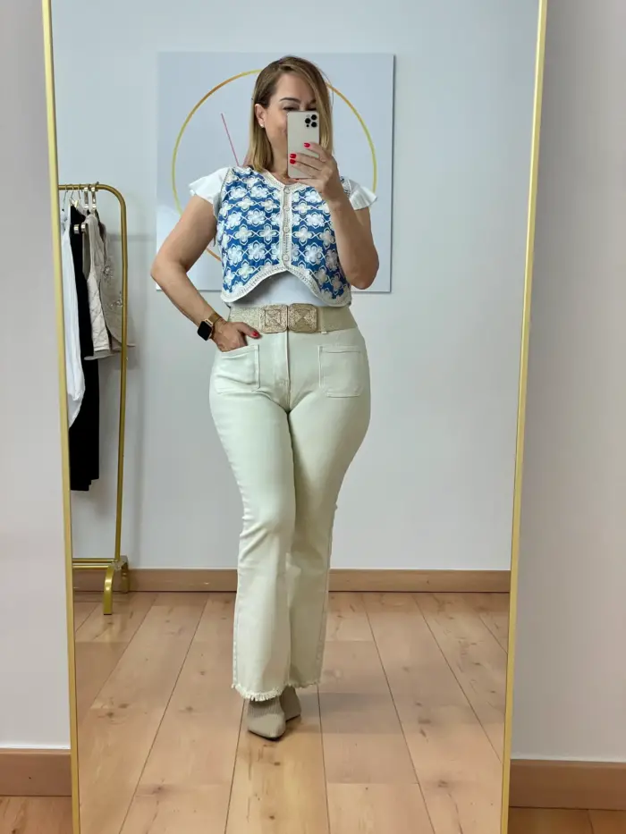 Estos vaqueros elásticos te van a encantar. Llevan dos bolsillos cuadrados en la parte delantera y trabillas en la cintura. En la parte trasera también llevan dos bolsillos. El bajo es acampanado y va desflecado